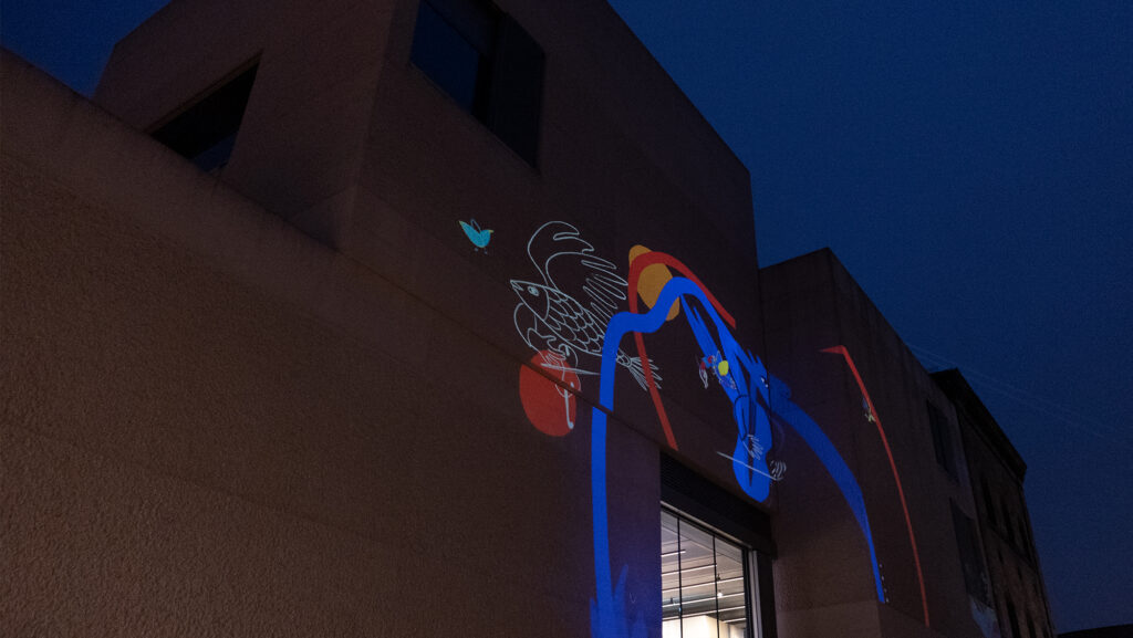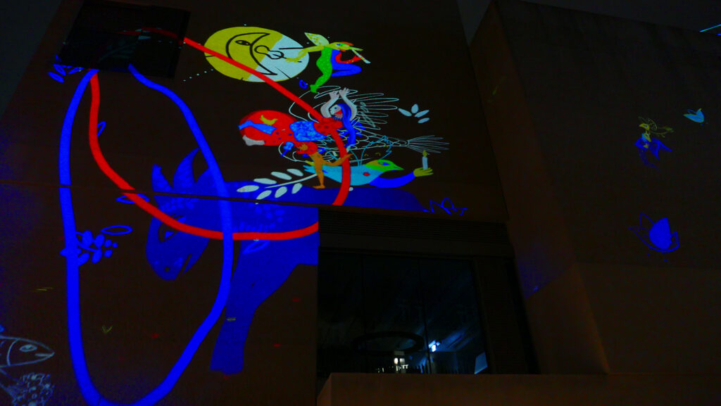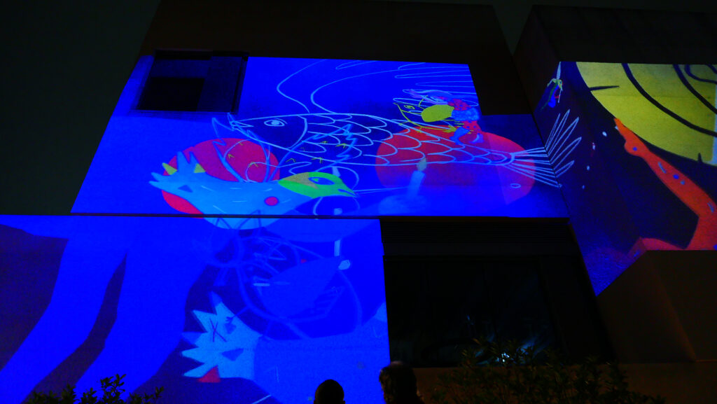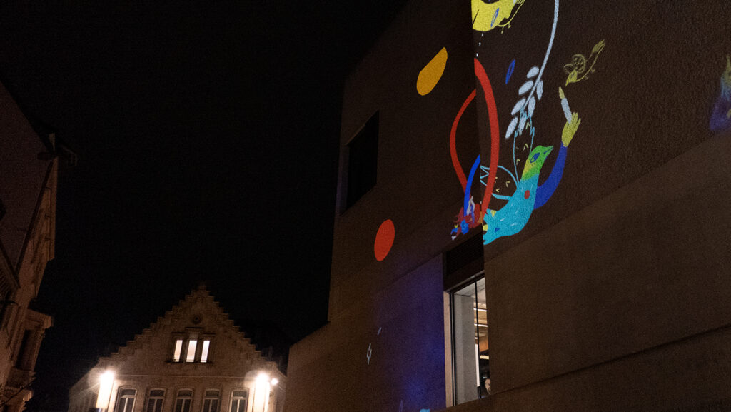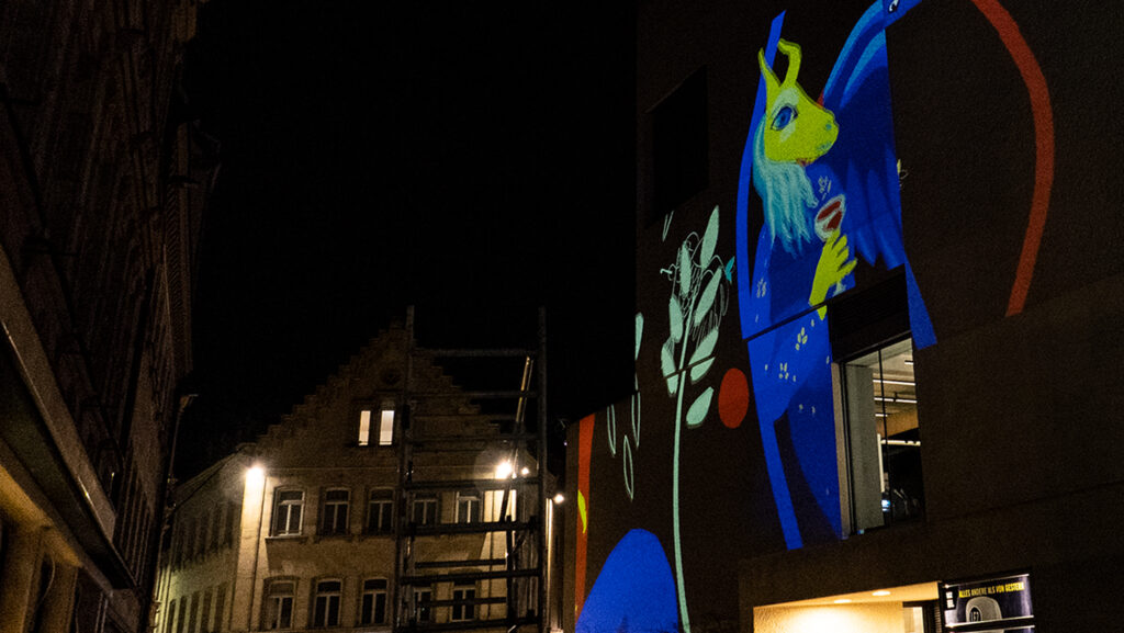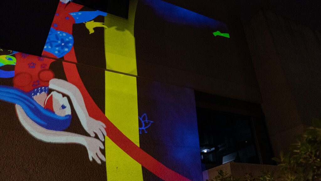 Inspiriert von Chagalls schwebenden Figuren, tanzenden Tieren und träumenden Zirkuswesen verwandelt die Projektion die Architektur des Gebäudes in ein leuchtendes Wandgemälde.