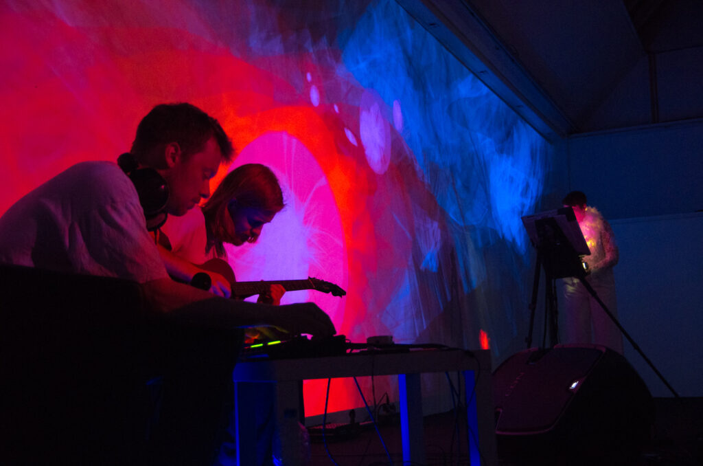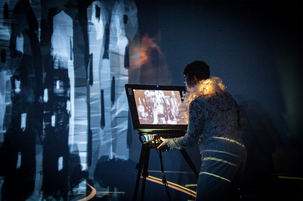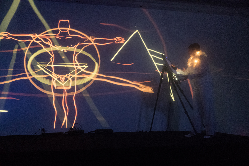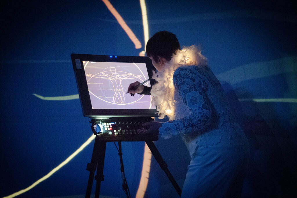 Die Lichtgemälde werden auf der Bühne an einem Monitor gemalt und großflächig an die Wände projiziert.