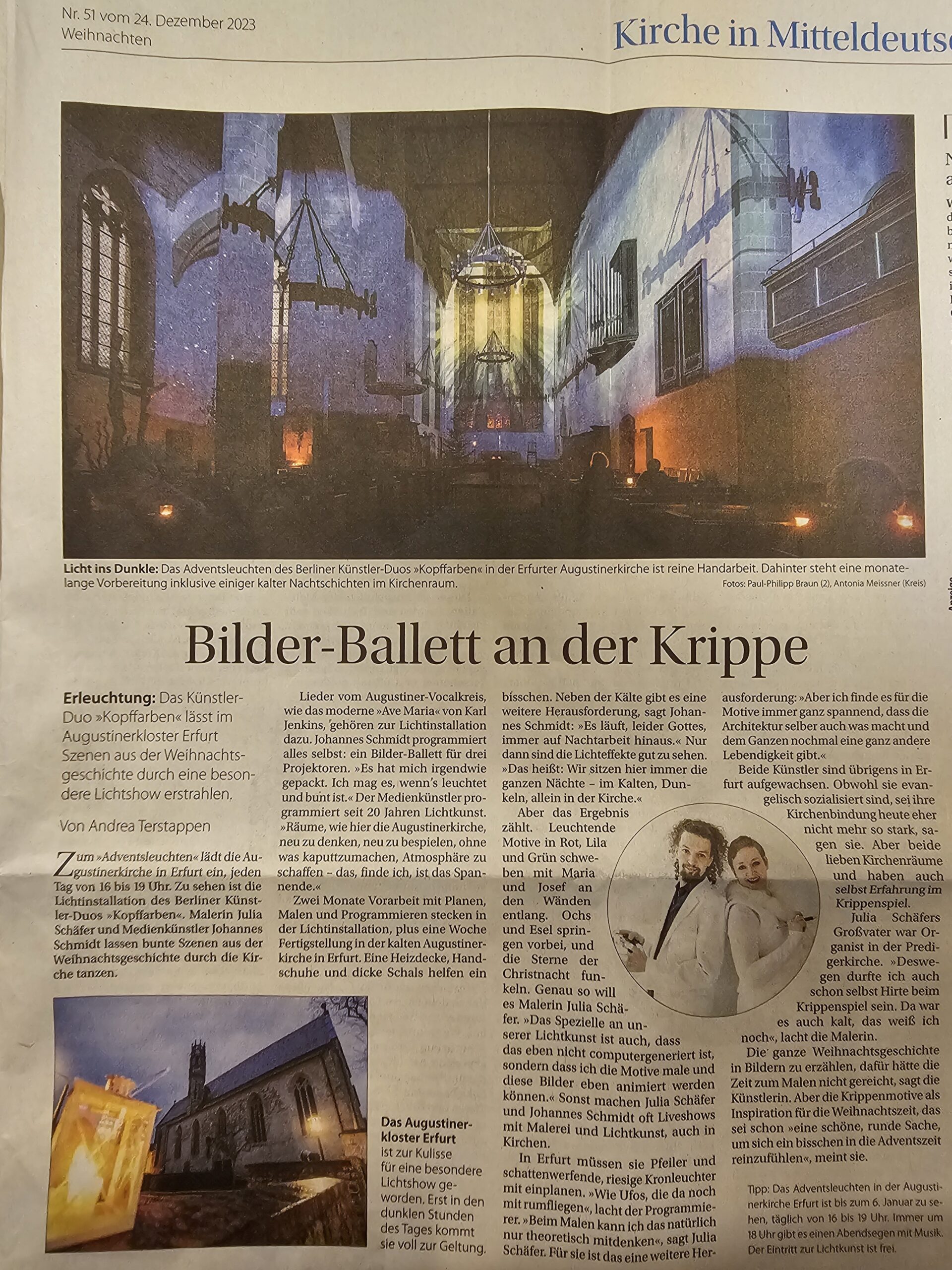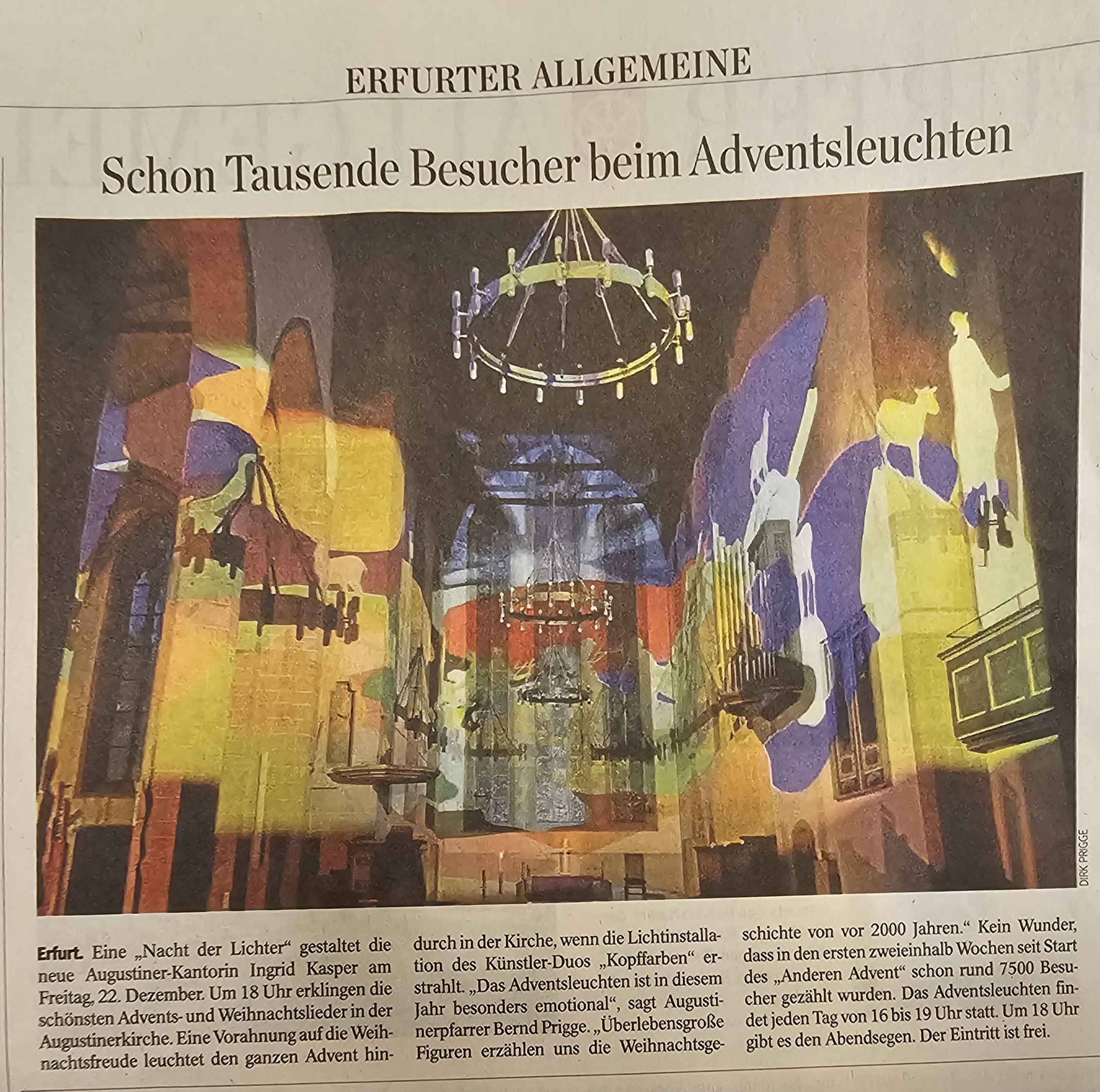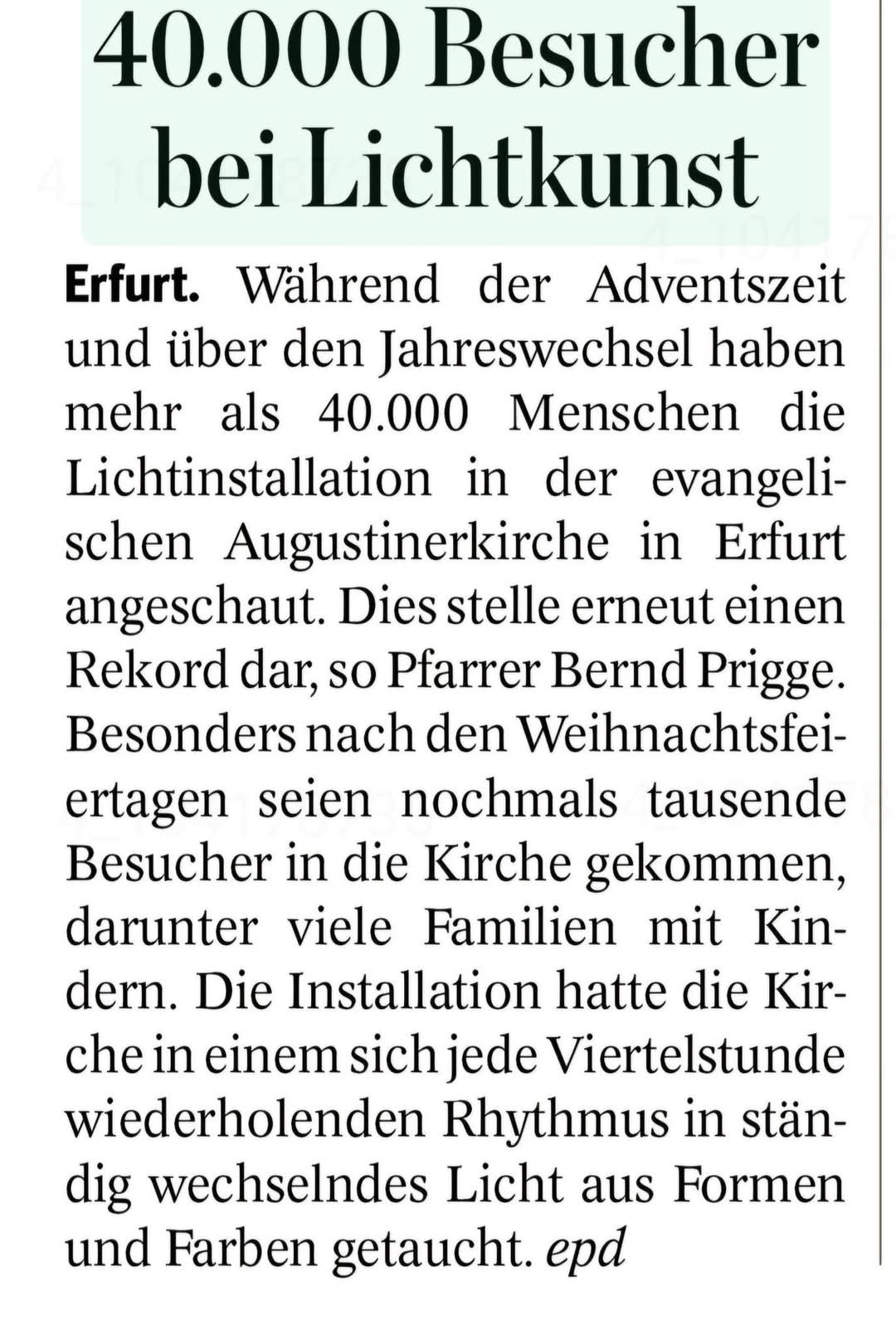 Mit einem Besucherrekord ist die Lichtkunst in der Evangelischen Augustinerkirche in Erfurt zu Ende gegangen. In den vergangenen 36 Tagen besuchten über 17.000 Menschen die Installation. Dabei wurden überlebensgroße Figuren aus der Weihnachtsgeschichte der Bibel in leuchtenden Farben an die Kirchenwände projiziert. Das Berliner Künstler-Duo „Kopffarben“ gestaltete die Aktion. „Allein am letzten Abend kamen über 1.000 Interessierte in die Kirche“, freut sich Augustinerpfarrer Bernd Prigge. „Die Installation hat wie keine bisher die Menschen emotional angesprochen. Obwohl es oft kalt war, blieben viele länger als sonst in der Kirche.“ (…)