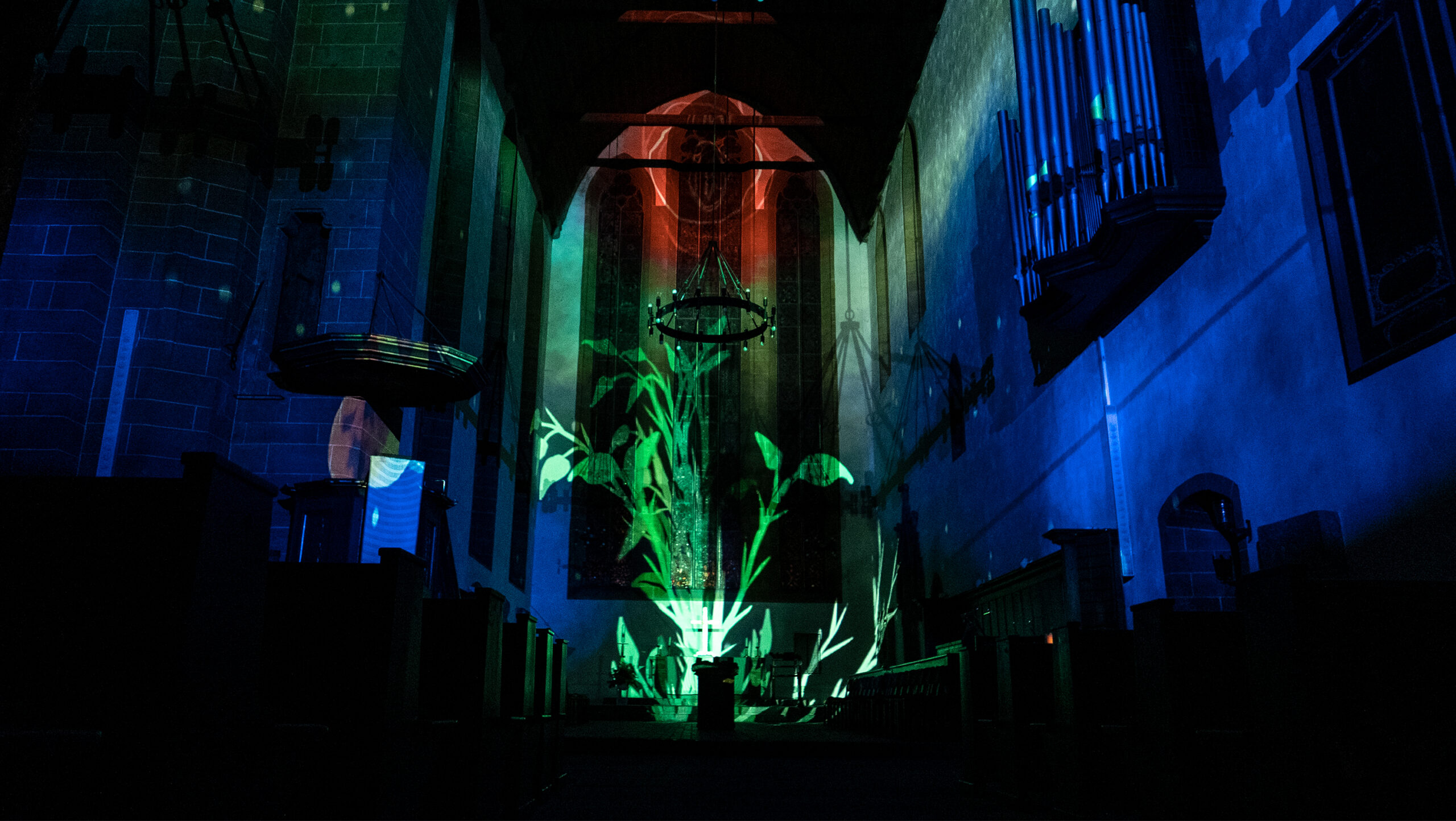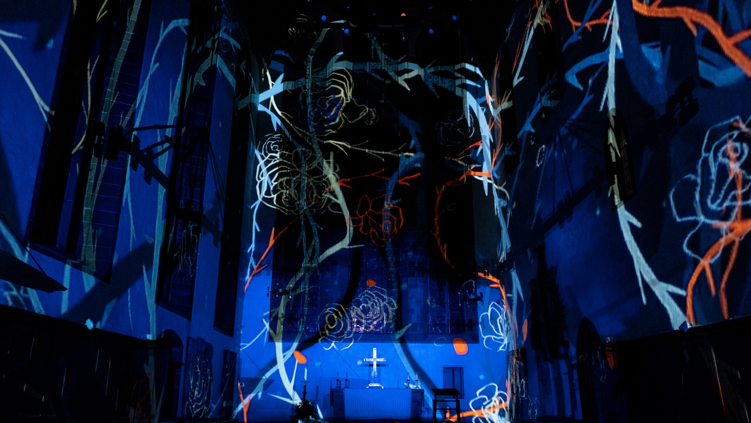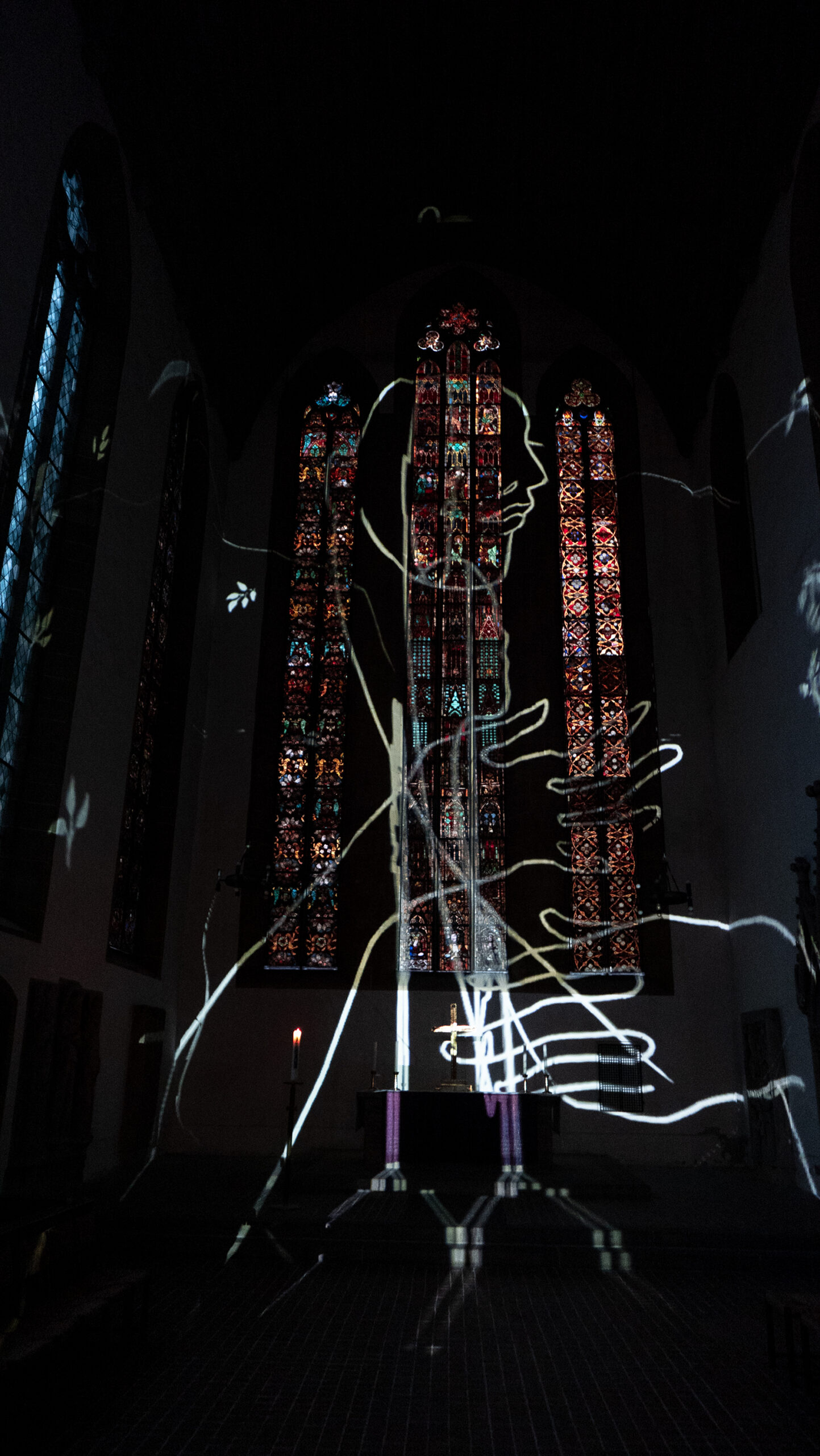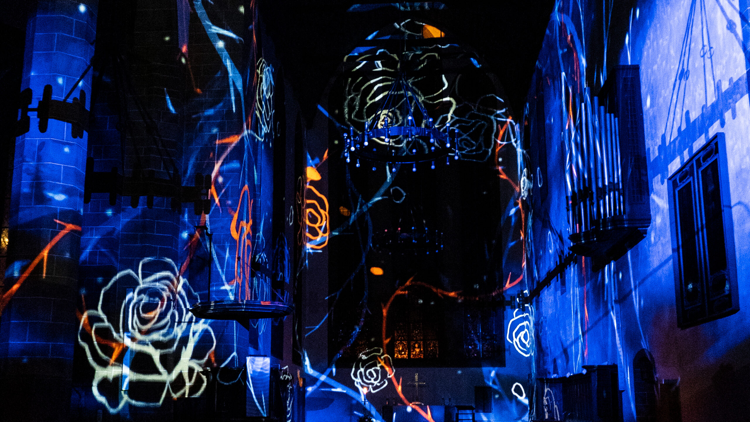 Im Advent 2023 sowie 2025 inszenierte das Lichtkunstduo KOPFFARBEN im Augustinerkloster zu Erfurt großformatige Lichtinstallationen, die zum Besuchermagnet wurden.